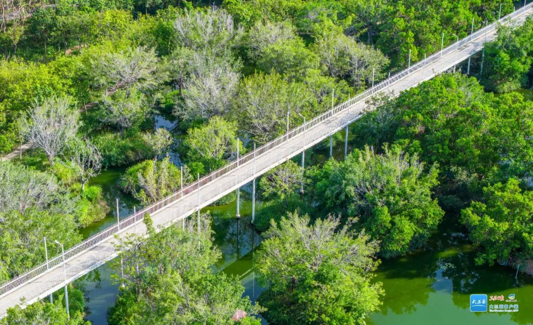 走进海棠河生态公园,绿草如茵、绿树成荫、鲜花点缀,宛如一幅层次丰富的热带生态画卷。园内精心打造的生态步道与骑行道蜿蜒其中,椰子树、遮阴乔木与三角梅在河海间相映成趣,茂密的红树林则成为生物栖息的乐园。