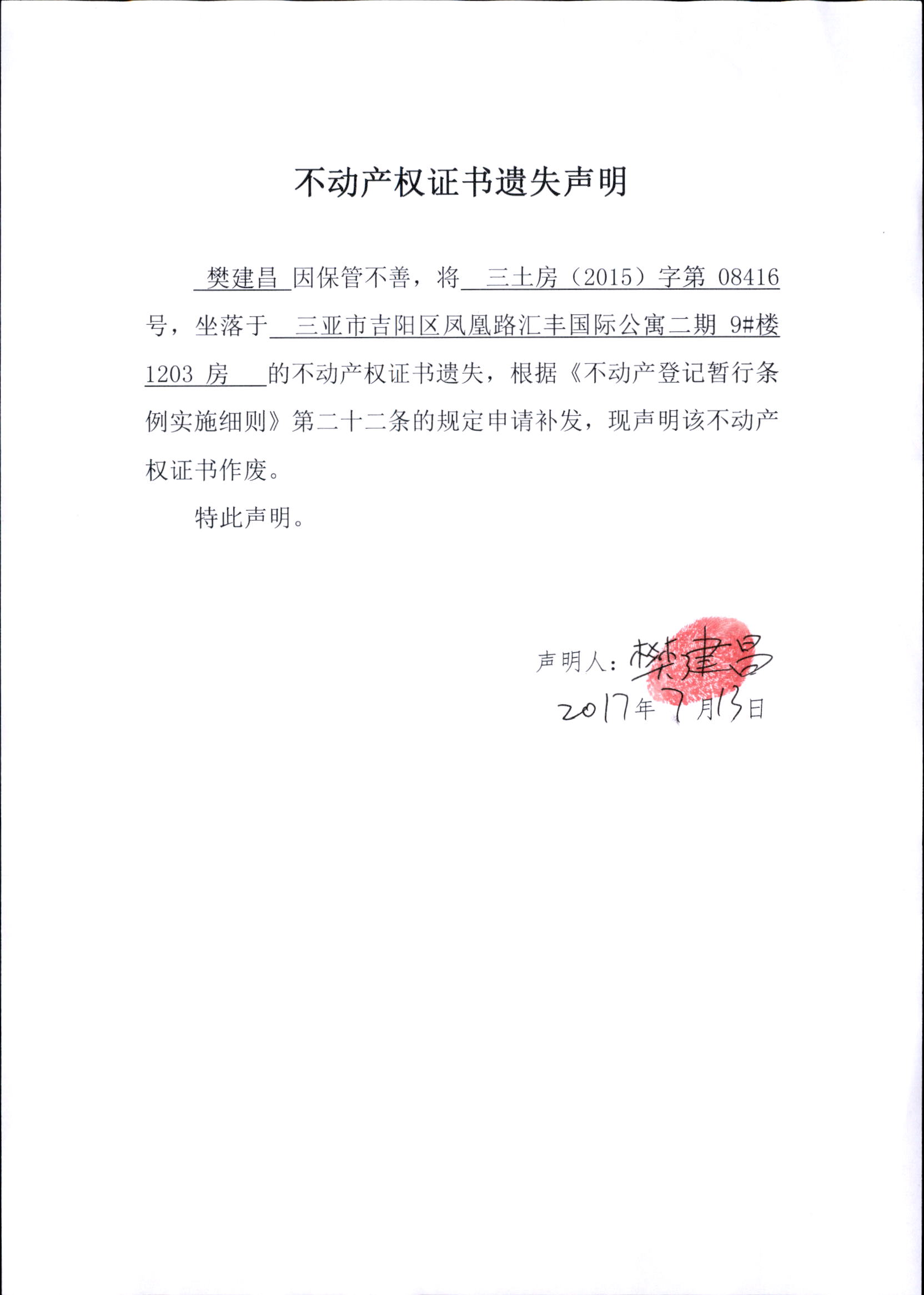 樊建昌遗失声明