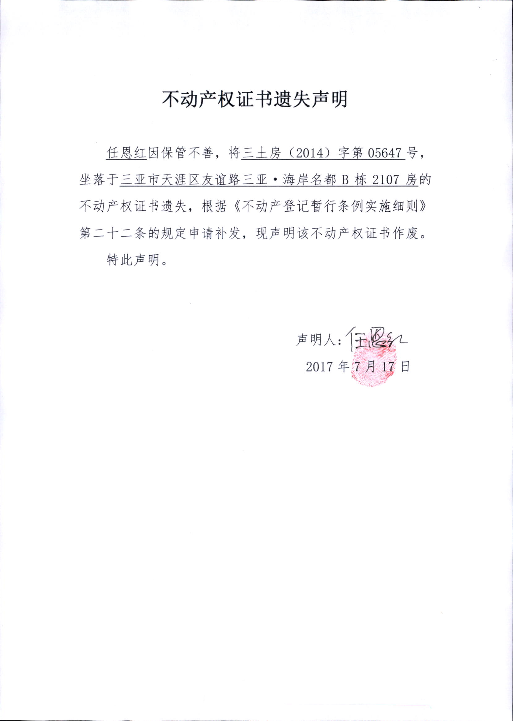 任恩红遗失声明