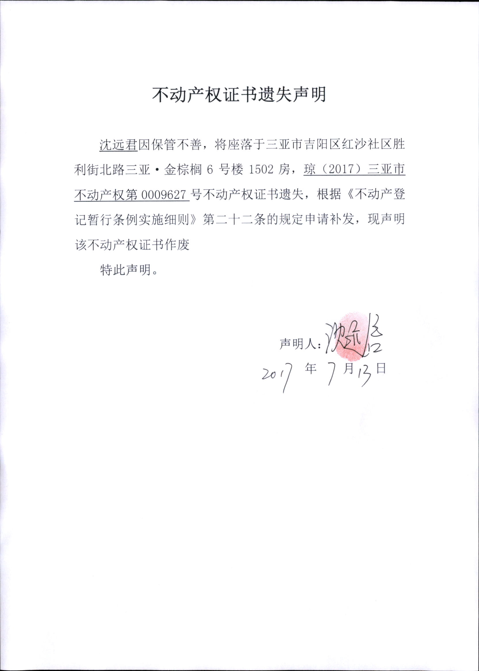 沈远君等3名权利人由于保管不善,将不动产权证书遗失,根据《不动产登记暂行条例实施细则》第二十二条的规定申请补发,现刊发三亚市国土资源局门户网站予以公示。