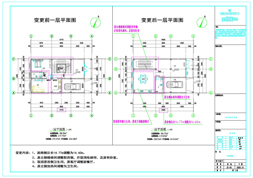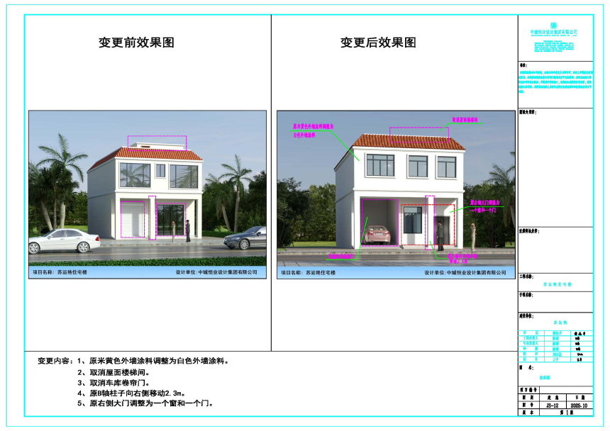 苏运艳向我局提出因原设计建筑布局不合理,就位于三亚市吉阳区红郊社区四组五巷私人住宅楼申请建筑平面布局优化调整,具体如下: 一、总平面图 1.总图座标有变化。 2.主要经济技术指标,总建筑面积减少、计容面积减少、占地面积减少、建筑密度及容积率相应的减少。 3.±0.000的绝对标高为15.80米、调整为16.90米。 二、地下负一、负二层平面图 1、原南侧总长14.77m调整为14.60m。 2、原北侧楼梯间调整到西侧,并取消电梯间。 3、层高4.2m调整为4.1m。 三、一层平面图 1、原南侧总长14.77m调整为14.60m。 2、原北侧楼梯间调整到西侧,并取消电梯间及原有卧室。 3、取消原西侧卫生间,原客厅调整厨餐厅。 4、原北侧加热间调整为卫生间。 四、二层平面图 1、原南侧总长14.77m调整为14.60m。 2、原北侧楼梯间调整到西侧,并取消电梯间及原有卧室。 3、取消原西侧卫生间。 4、取消原东侧卧室套内卫生间。 5、取消原东侧卧室套内卫生间 五、立面图 立面根据平面功能做相应的改变。 根据有关规定,现按程序对该项目调整前后建筑设计方案进行批前公示,公示时间为7个工作日(2025年11月14日至2025年11月24日)。如需听证或对上述变更内容有意见,请于公示结束前反馈,意见反馈方式: 一、电子邮件请发送到:sy88362336@sanya.gov.cn; 二、书面意见请邮寄到:三亚市吉阳区吉阳大道218号A1栋401室,三亚市自然资源和规划局吉阳分局,邮政编码:572000; 三、咨询电话:88712568,联系人:谭毅金。 意见反馈请注明联系方式,单位反馈意见并加盖公章。 附件:1.调整前后对比效果图 2.调整前后对比总图 3.调整前后对比施工图