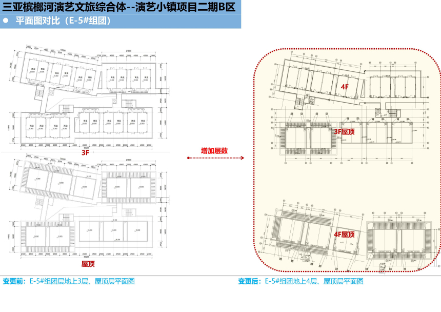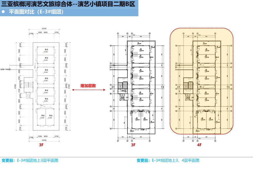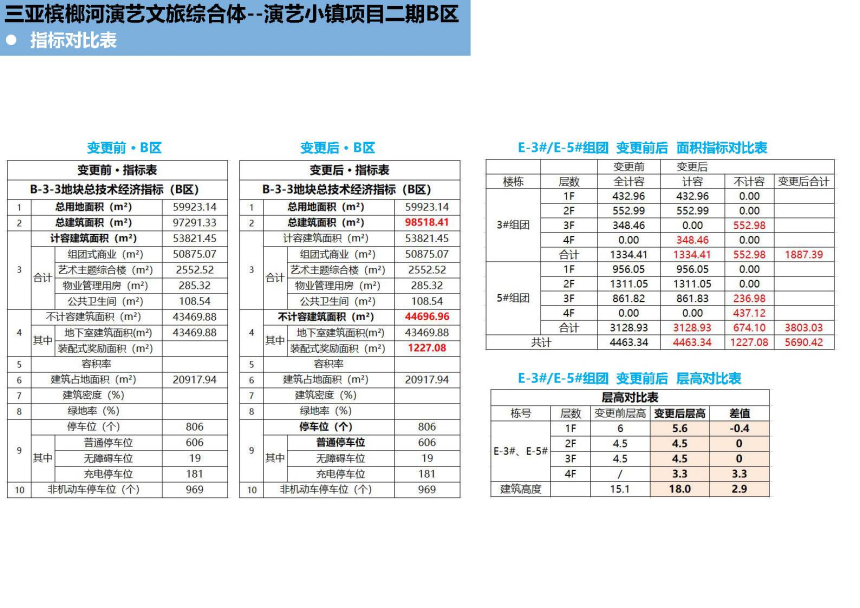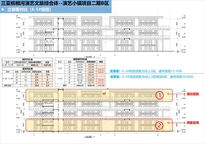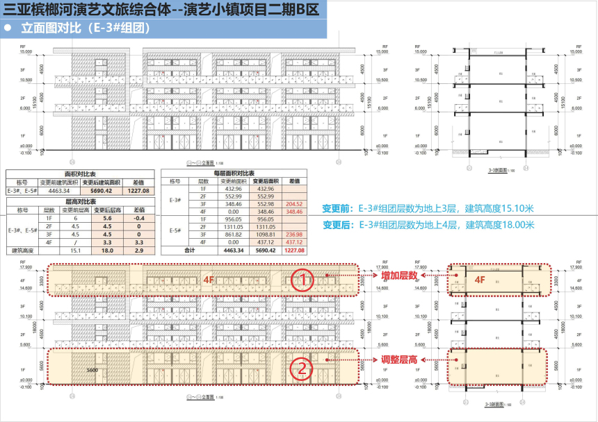 三亚春瑞实业有限公司建设的三亚槟榔河演艺文旅综合体-演艺小镇项目二期B区位于三亚市天涯区槟榔村委会,权属用地面积79920.28平方米。现建设单位申请在不突破地块控规的情况下增加装配式奖励建筑面积,具体如下: E-3#组团由原审批地上3层调整为地上4层,在第4层增加装配式奖励建筑面积552.98平方米,建筑高度由原审批15.10米调整为18.00米,其中第1层层高由原审批6.00米调整为5.60米,第2、3层层高维持4.50米不变,第4层层高3.30米。调整后E-3#组团总建筑面积为1887.39平方米(含装配式奖励建筑面积552.98平方米),其中计容建筑面积为1334.41平方米。 E-5#组团由原审批地上3层调整为地上3层局部4层,在第3层增加装配式奖励建筑面积236.98平方米,在第4层增加装配式奖励建筑面积437.12平方米,建筑高度由原审批15.10米调整为18.00米,其中第1层层高由原审批6.00米调整为5.60米,第2、3层层高维持4.50米不变,第4层层高3.30米。调整后E-5#组团总建筑面积为3803.03平方米(含装配式奖励建筑面积674.10平方米),其中计容建筑面积为3128.93平方米。 根据有关规定,现按程序对该项目进行批前公示,公示时间为7个工作日(2025年12月12日至2025年12月22日),如需听证或对该项目有意见,请于公示结束前反馈,意见反馈方式: 一、电子邮件请发送到:sy88362336@sanya.gov.cn; 二、书面意见请邮寄到:三亚市河东路152号,三亚市自然资源和规划局建设工程科,邮政编码:572000; 三、咨询电话:88271879,联系人:于丰齐。 意见反馈请注明联系方式,单位反馈意见请加盖公章。 附件:1.项目区位图 2.调整前后对比图